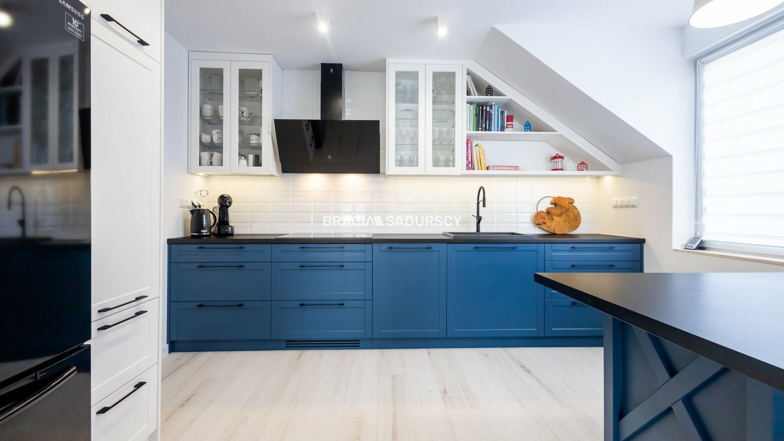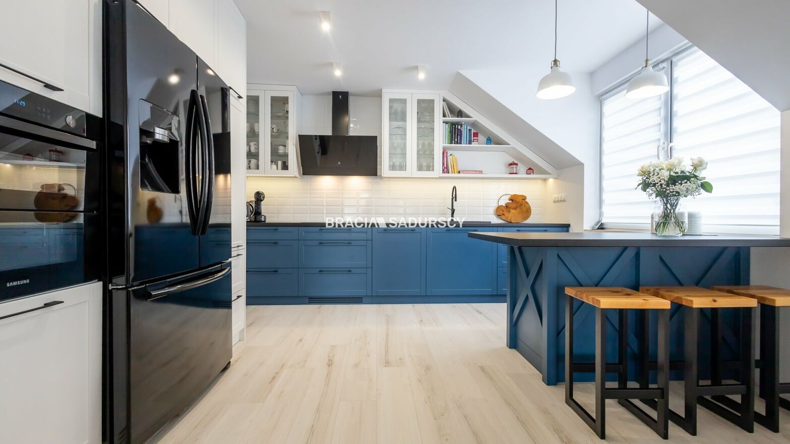W kuchni znajdziemy przyjemne dla oka, funkcjonalne meble wykonane na wymiar wzbogacone wyspą wyposażoną w nablatowe gniazdka. Wyposażenie AGD kuchni to lodówka typu french door z kostkarką i pojemną zamrażarką, okap zintegrowany z płytą grzewczą, nowoczesny piekarnik Dual Cook. Schody łączące parter z piętrem wykonano z drewna jaworowego, bielonego i lakierowanego.