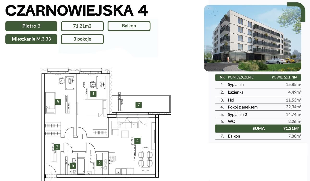 Powierzchnia 71,21m2 to dwie sypialnie, pokój dzienny z aneksem kuchennym, hol, łazienka i WC a dodatkowo balkon o powierzchni 7,88m2.